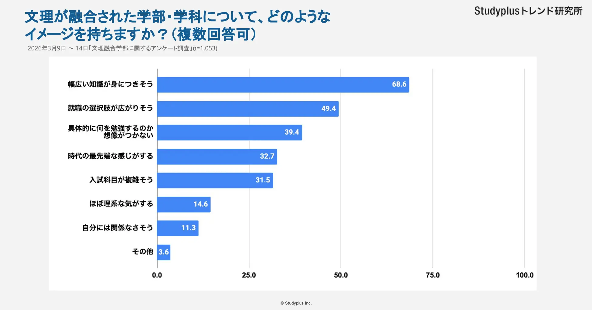 スタディプラスが運営するStudyplusトレンド研究所は3月31日、全国の高校1・2年生1053人を対象に実施した、「文理融合学部に関するアンケート調査」の結果をまとめ発表した。