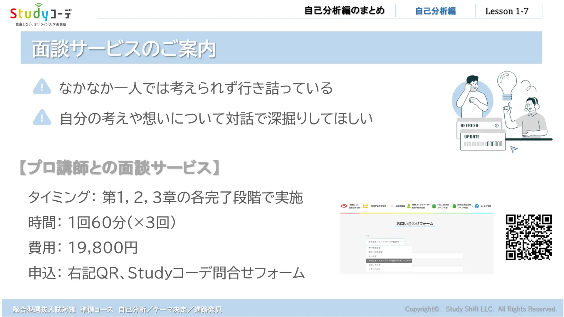 サービス内容は、オンデマンド講座受講者を対象に、60分の面談を3回実施する構成で、自己分析や探究テーマ設定など各章の完了段階に合わせて実施される。費用は1万9800円。
