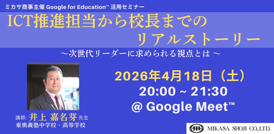 ミカサ商事は、教職員向けICT活用セミナー「ICT推進担当から校長までのリアルストーリー 〜次世代リーダーに求められる視点とは〜」を4月18日にオンラインで開催する。