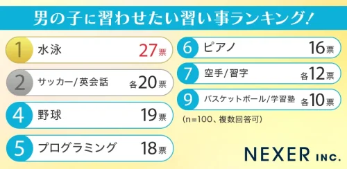 子どもに習わせたい習い事ランキング 男女別でTOP10を発表 =NEXERと平石こどもクリニック調べ=
