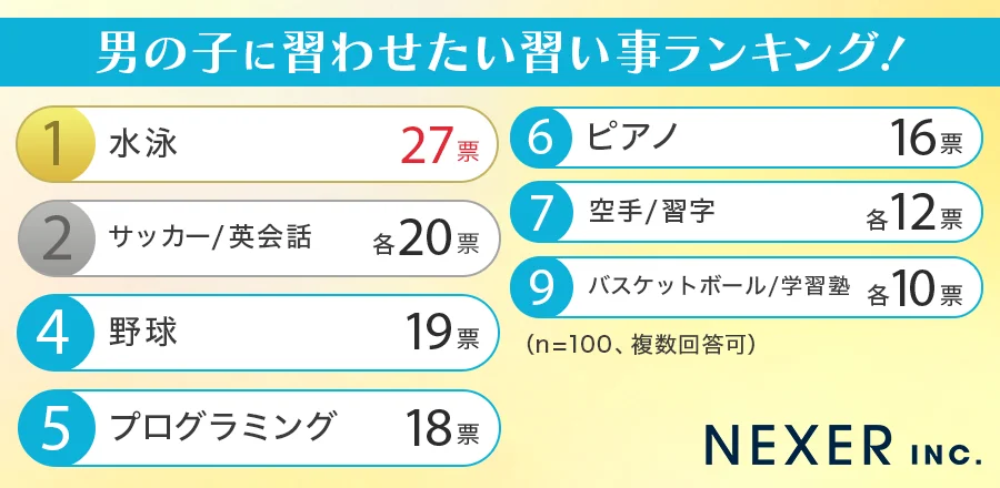 それによると、男の子に習わせたい習い事は、1位「水泳」、2位「サッカー/英会話」、4位「野球」、4位「プログラミング」、5位「ピアノ」、7位「空手/習字」、9位「バスケットボール/学習塾」となった。
