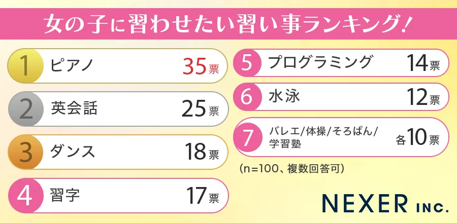 女の子に習わせたい習い事は、1位「ピアノ」、2位「英会話」、3位「ダンス」、4位「習字」、5位「プログラミング」、6位「水泳」、7位「バレエ/体操/そろばん/学習塾」となった。