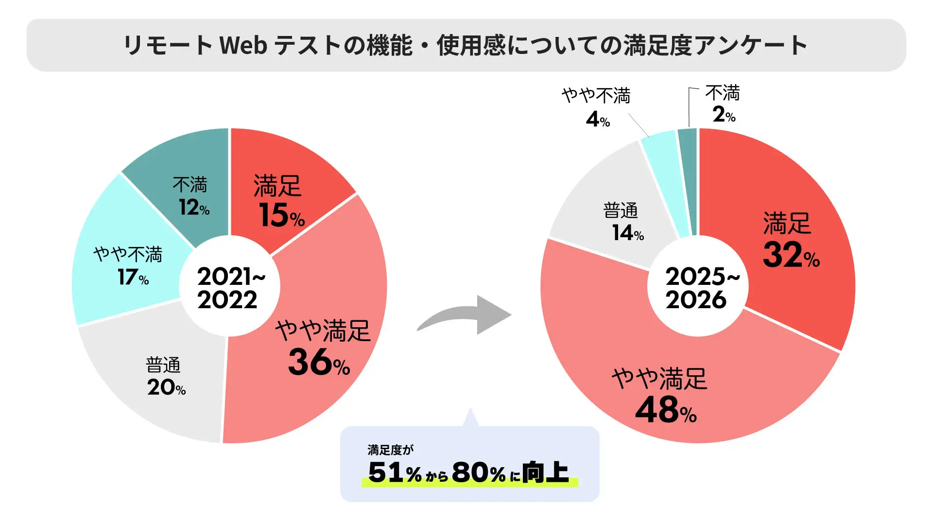 2025~2026年実施の最新の利用者アンケートによると、受験者満足度(「満足」+「やや満足」合計)は80%となり、前回調査の51%から大きく向上した。