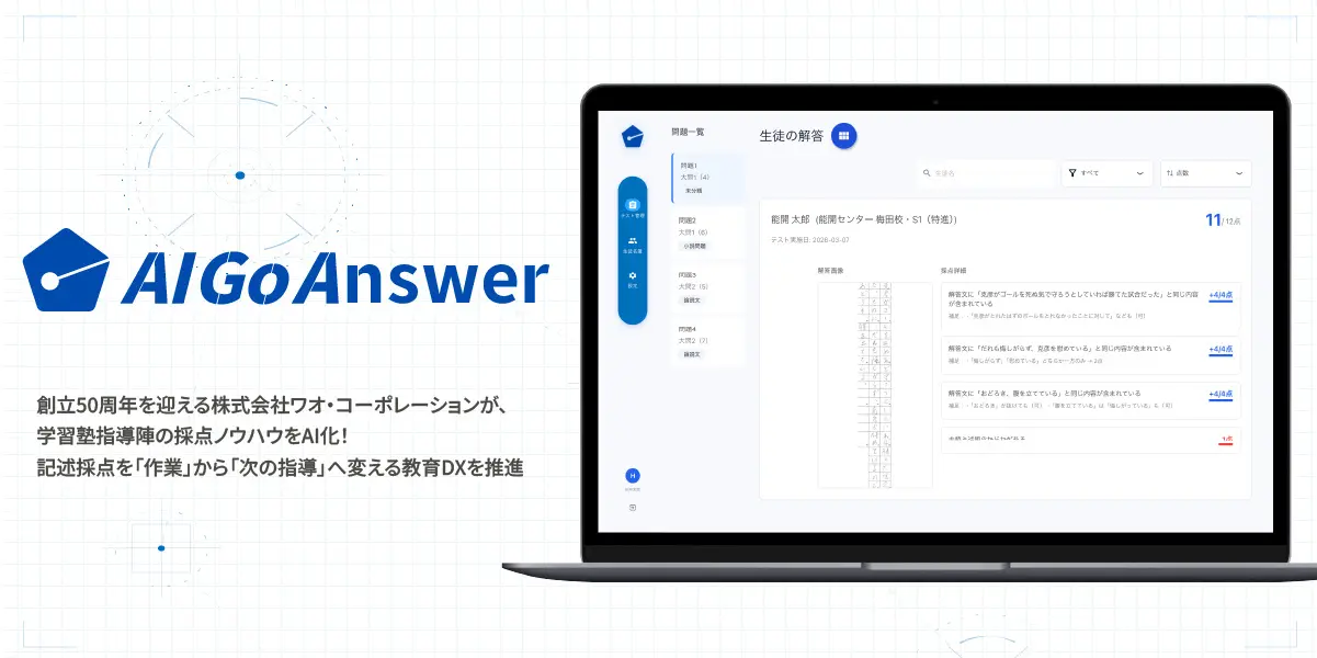 ワオ・コーポレーションは1日、子会社のワオテックと、国語記述問題AI自動採点システム「AI Go Answer(エーアイゴーアンサー)」を共同開発したことを発表した。