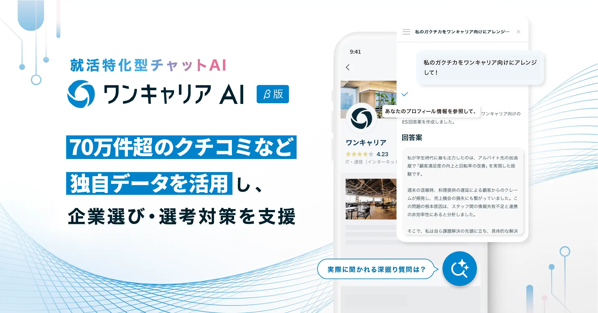 - ワンキャリア、就活特化型チャットAI「ワンキャリアAI」β版を提供開始