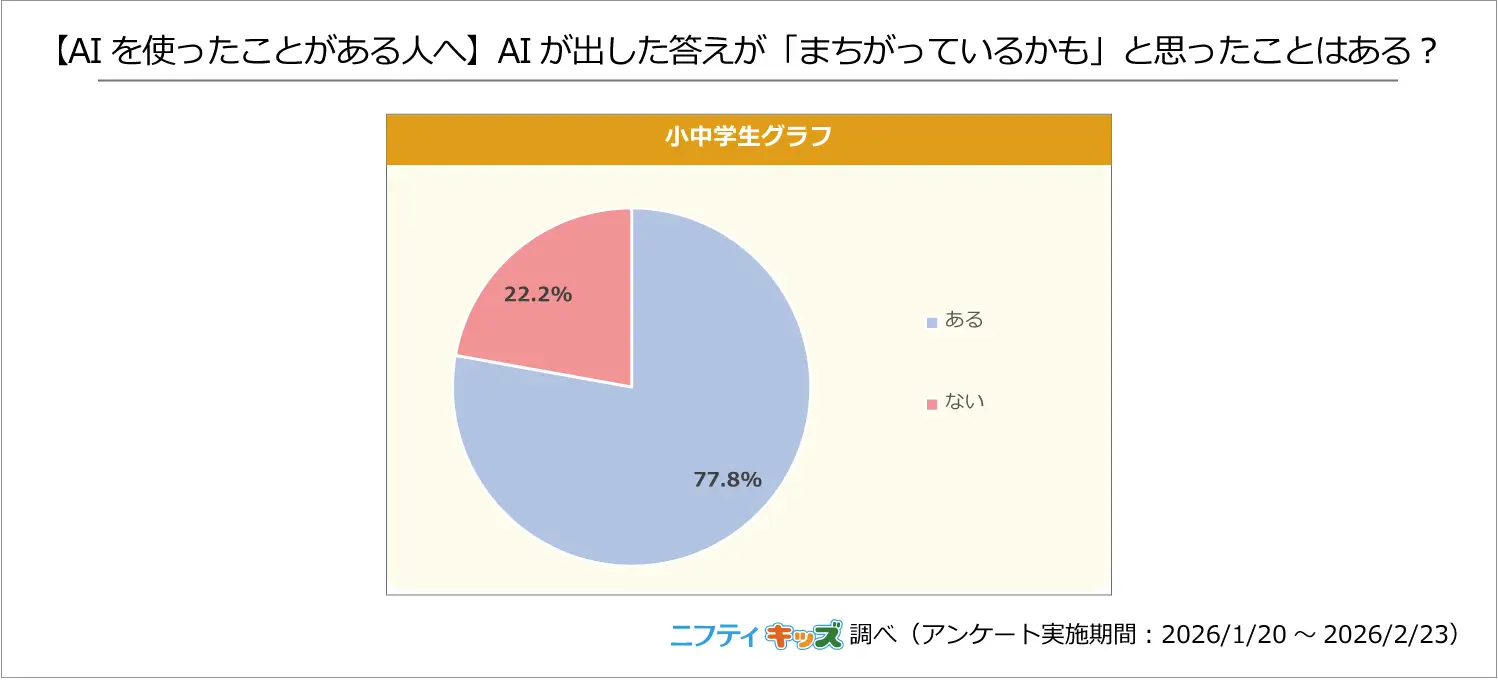 一方で、AIの答えに疑問を持った経験がある子どもも多く、AI利用経験者のうち約8割が「まちがっているかも」と思ったことがあると回答した。