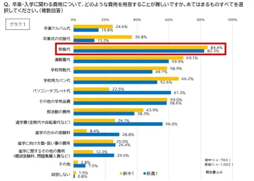 それによると、卒業・入学に関わる費用について、「制服代の準備が難しい」と回答した世帯は、新中学1年生で84.4%、新高校1年生で82.3%と、2022年の調査開始以来、最も高い8割以上になった。