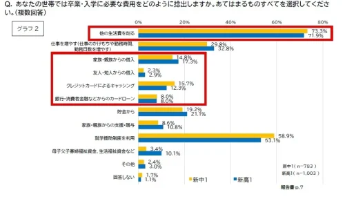 また、卒業・入学にかかる費用の捻出方法について聞いたところ、2025年調査より約10ポイント多い70%以上の保護者が「他の生活費を削る」と回答。具体的には、「親自身の食事量を減らしている」79.4%、「冷暖房をあまりつけないようにしている」67.4%が多く、生活の様々な費用を削って捻出していることが明らかになった。