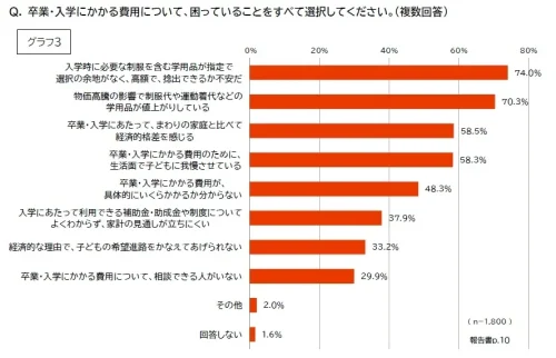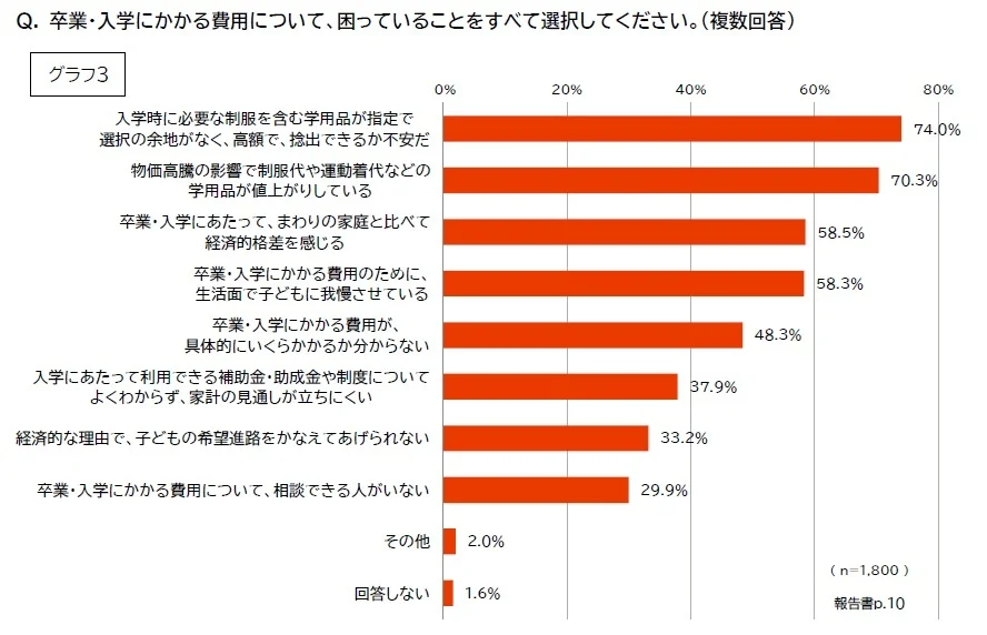 さらに、「卒業・入学に関する困りごと」を聞いたところ、7割以上の保護者が高額な指定学用品や物価高騰による学用品の値上げなどの経済的な負担を挙げた。また、6割近くの保護者がこの時期に「周囲と比べて経済的格差を感じる」、「子どもに我慢させている」と感じるなど気持ちの面でも負担感があることが分かった。