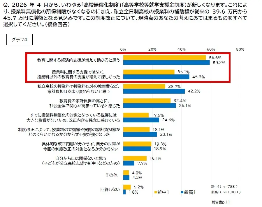 最後に、4月からの「高校無償化」について聞いたところ、半数以上の保護者が「教育に関する経済的支援が増えて助かると思う」と肯定的に捉えている一方で、新高校1年生の保護者は4割以上が「授業料に関する支援ではなく、授業料以外の教育費の支援が増えてほしかった」と回答した。