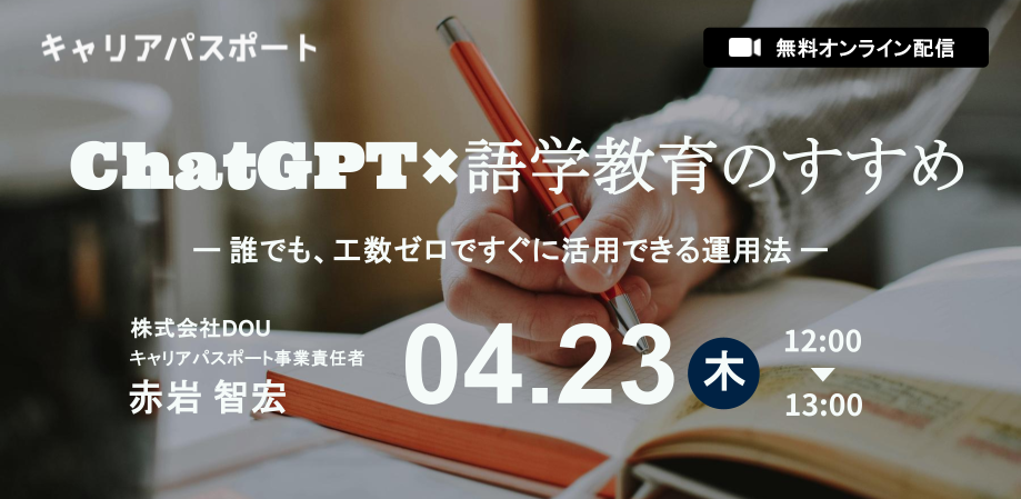 DOUは、教職員・語学教育従事者を対象としたオンラインセミナー「ChatGPT×語学教育のすすめ ~誰でも、工数ゼロですぐに活用できる運用法~」を4月23日に開催する。