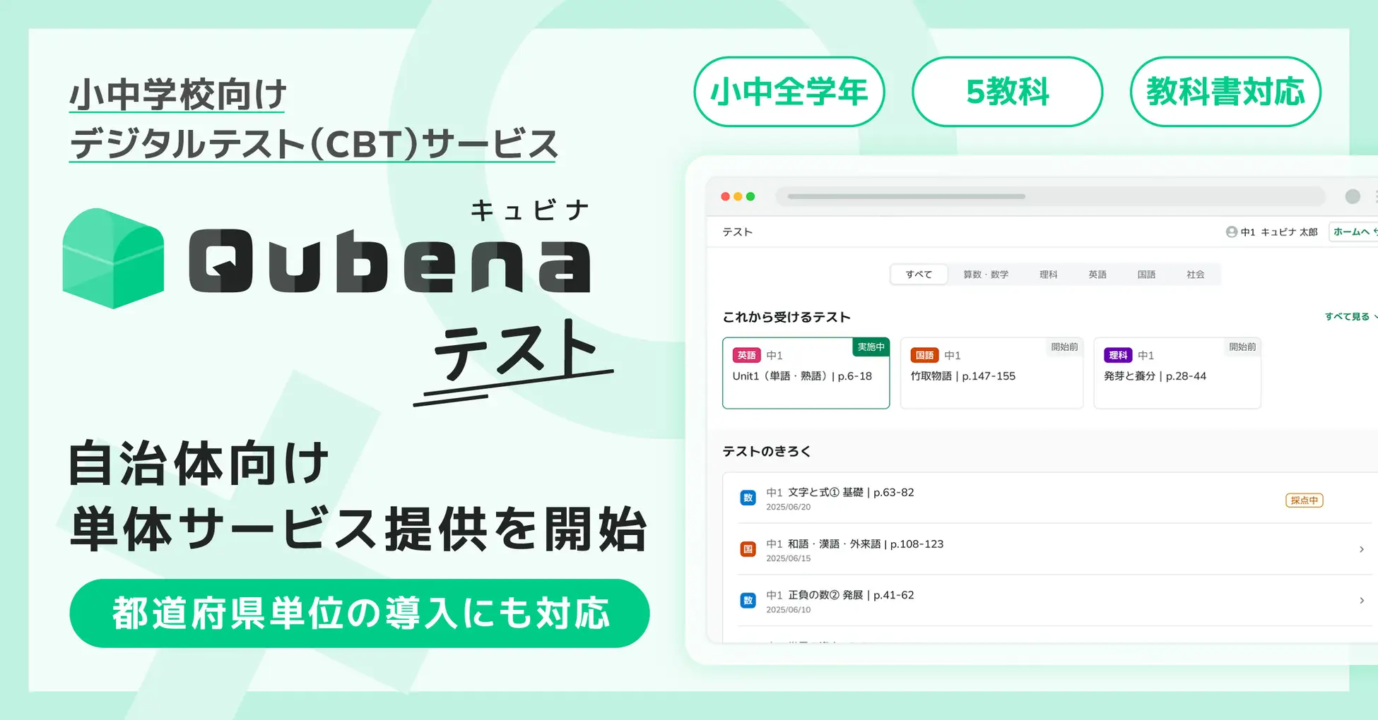 対象は自治体で、都道府県単位での導入もでき、広域でのCBT活用などの取り組みを後押しする。また、キュビナ テストに搭載の教科書単元ごとの理解度確認テストに加え、自治体の学力調査など、自治体独自の問題を搭載し、キュビナ テスト上でテストが実施できる機能(オプションサービス)も、2026年度内に提供する予定。