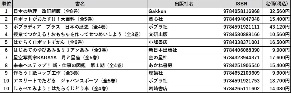 それによると、「セット部門」の第1位は『日本の地理 改訂新版』(Gakken)となった。同書は全8巻で、目を惹く図解と豊富な資料によって、各地方・各県の様子を深く理解できる、調べ学習に最適なシリーズ。