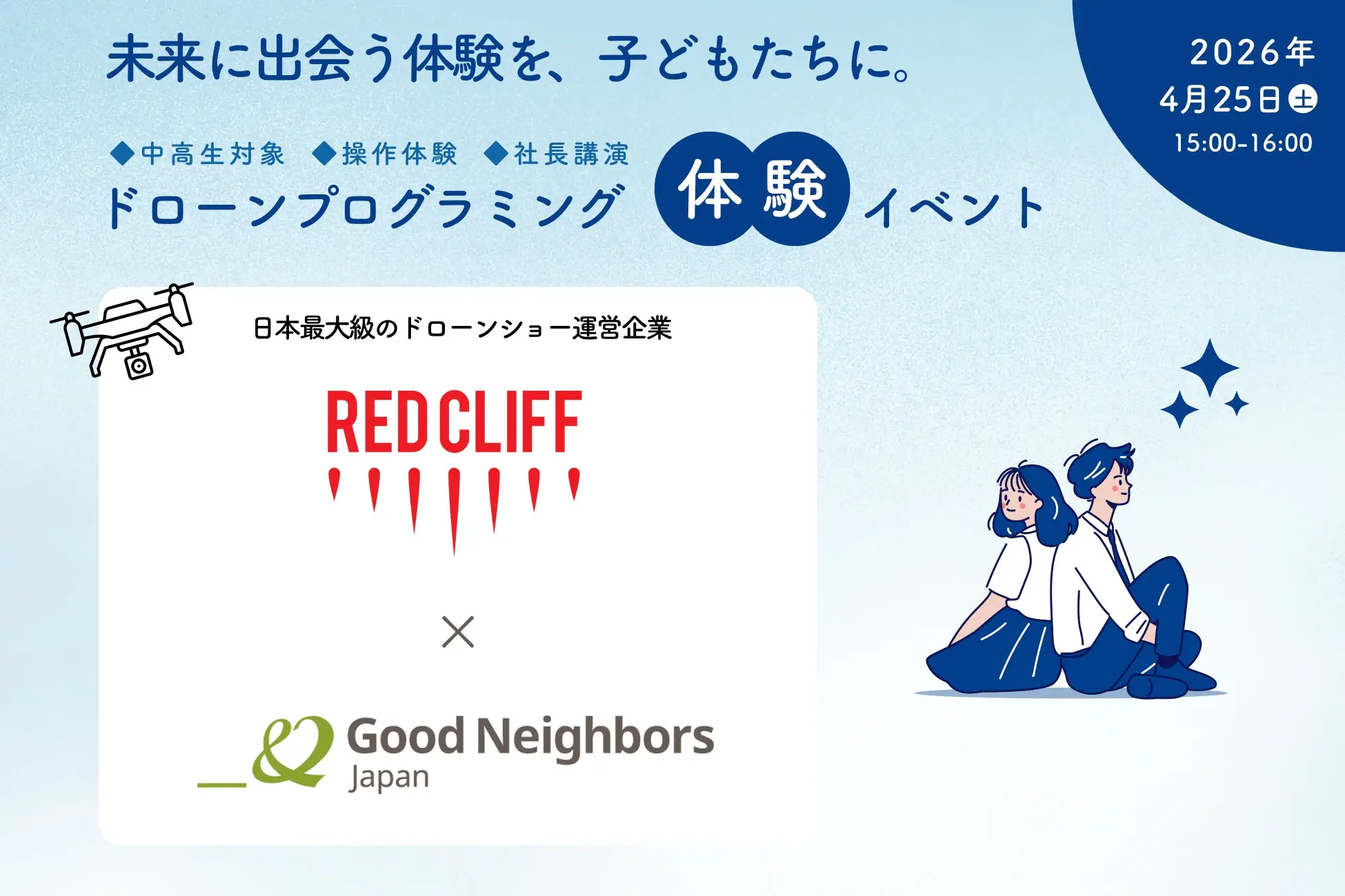 グッドネーバーズ・ジャパンは、レッドクリフと、ひとり親家庭の中高生を対象にした無料の「ドローンプログラミング体験イベント」を、4月25日に開催する。
