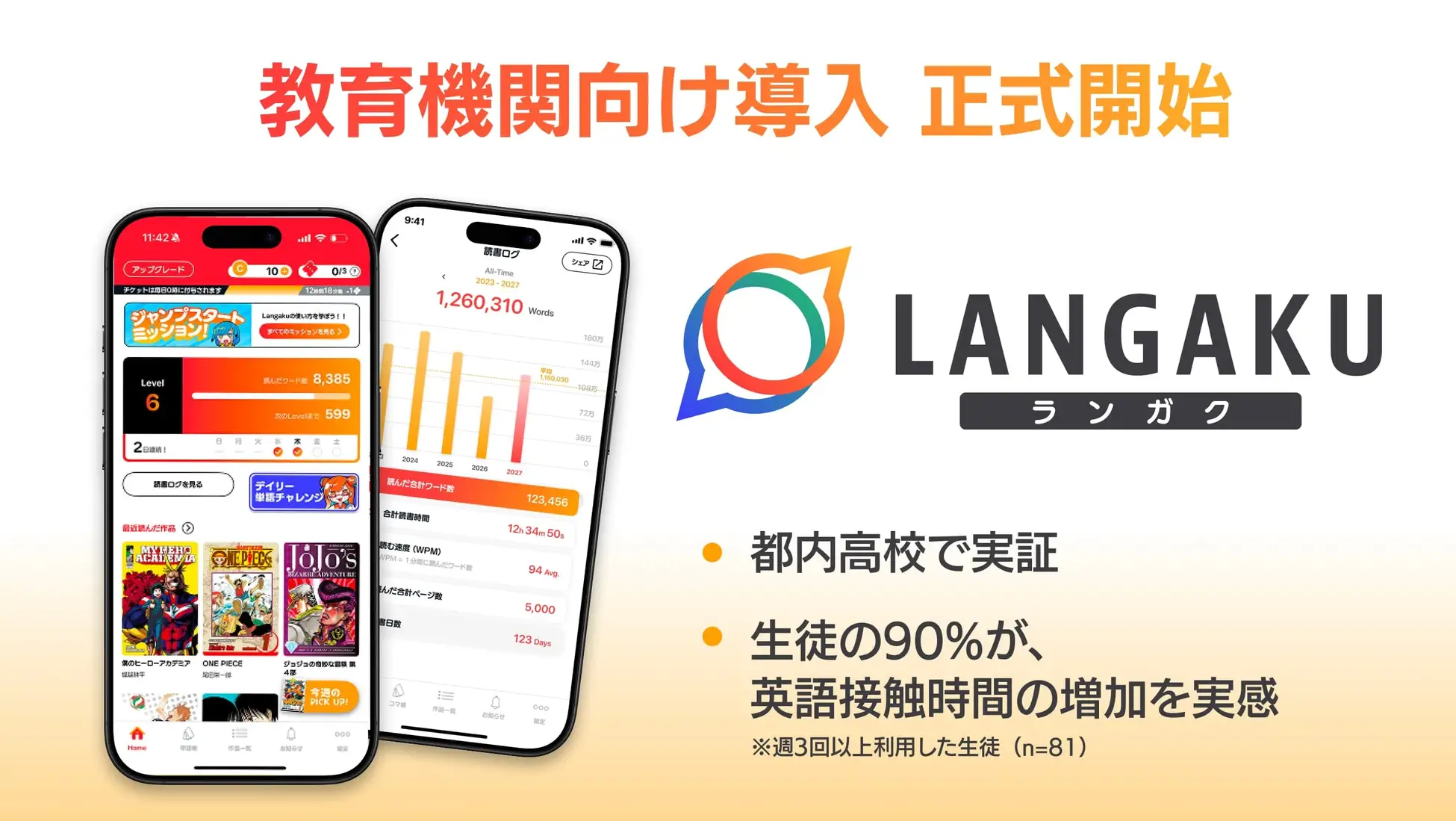 Langakuは、マンガで楽しく英語多読を行うことで、自然に英語脳をつくることを目指したアプリ。「楽しいから続く」を起点に英語学習を習慣化し、自然な形で読解力・語彙力の向上を支援する。