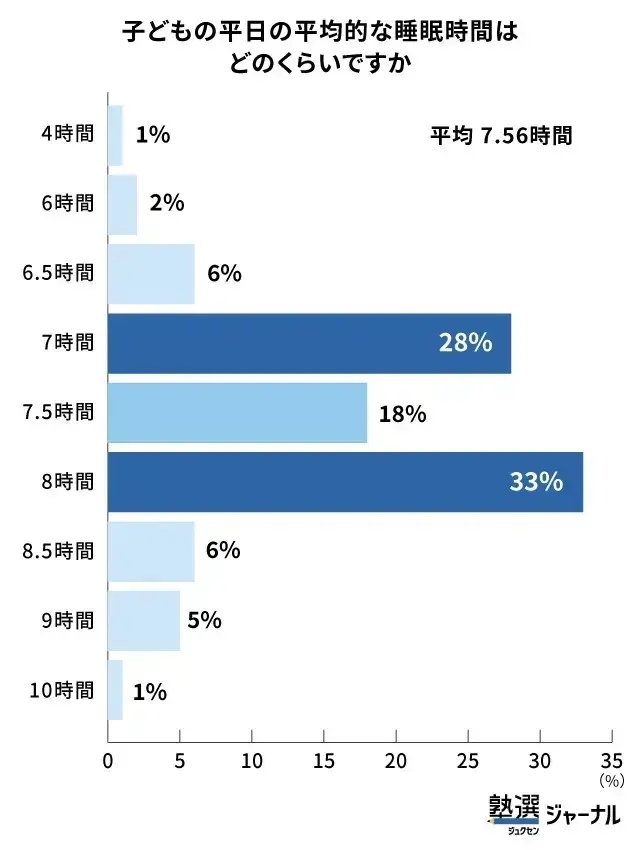 それによると、中学生の睡眠時間は「8時間」33%が最も多く、次いで「7時間」28%で、全体平均は7.56時間だった。極端に短い睡眠時間は少なく、一見すると「ある程度は眠れている」と感じやすい水準だが、厚生労働省「健康づくりのための睡眠ガイド2023」が示す中学生の推奨睡眠時間は8〜10時間で、今回の平均値との差は0.44時間=約26分。