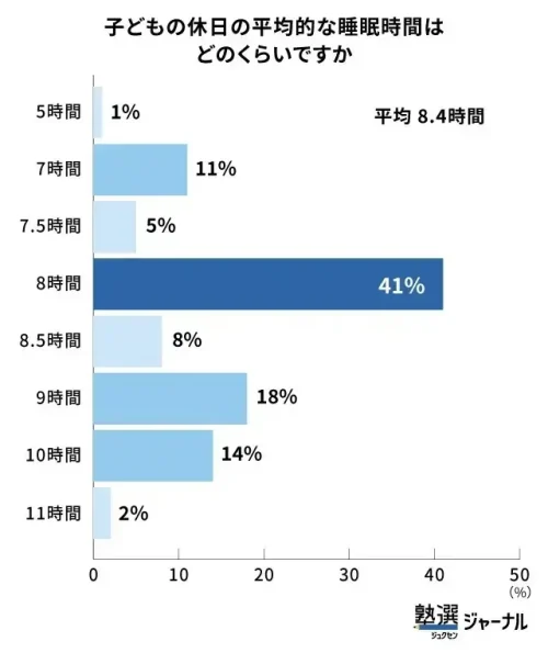 一方、休日の平均睡眠時間は8.4時間と、平日よりも長くなる傾向が見られた。学校がない分、起床時間の制約がなくなるためだ。休日の起床時間についての方針は、「平日より1〜2時間程度なら寝坊OK」53%、「好きなだけ寝かせてあげる」33%と回答した家庭が86%で、多くの保護者が休日はゆっくり休ませたいと考えているのが分かる。