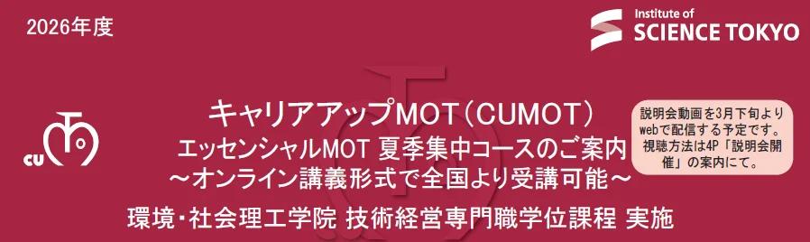 東京科学大学(Science Tokyo)は、6月開講の社会人向けMOT(技術経営)講座「エッセンシャルMOT夏季集中コース(2026年度)」の受講生を5月1日まで募集している。