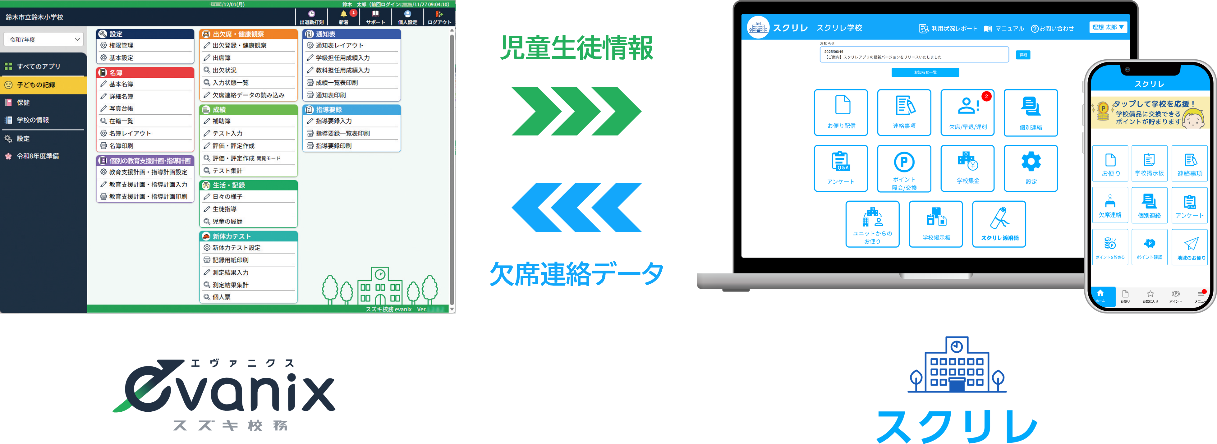 今回の連携では、「evanix」上の児童生徒名簿データを「スクリレ」と紐づけることで、保護者が「スクリレ」アプリから送信した欠席・遅刻・早退などの連絡内容が「evanix」に自動送信される。教職員はそのデータを出席簿に読み込むことで反映でき、これまで必要だった転記作業の手間を省けるようになる。