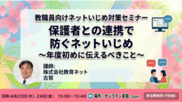 教育ネットは、教職員向けオンラインセミナー「保護者との連携で防ぐネットいじめ~年度初めに伝えるべきこと~」を、4月23日と24日に開催する。