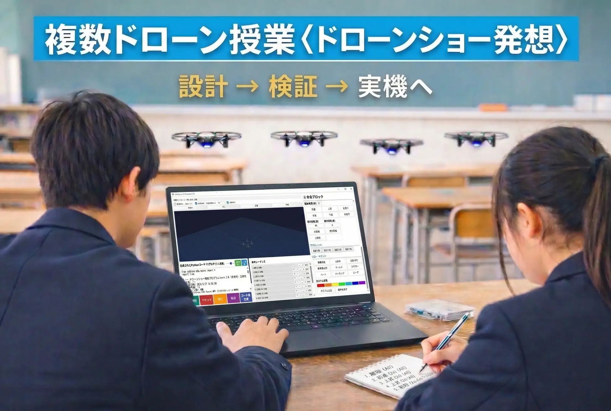 同サービスは、複数のドローンの動きを設計・検証し、実機での実行までを一体的に扱える授業モデル。ブロックベースで動きを設計し、シミュレーターで確認した後、Pythonコードとして実機に反映する一連の流れを、学校現場で扱いやすい形に整理している。