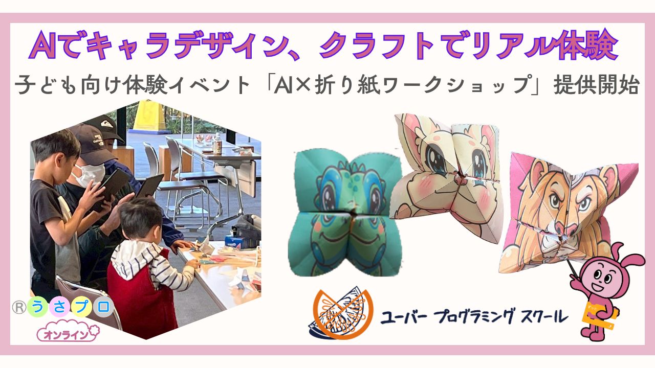 AIを活用してオリジナルのキャラクターを生成し、折り紙テンプレートへと展開、その場でプリントアウトして、実際に折り紙を折る「デジタル×アナログ」が融合するコンテンツ。クラウド型プラットフォーム「うさプロオンライン」で提供する。