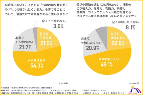 また、AI時代に求められる力を家庭だけで育てることに限界があると感じる保護者も多く、約8割が家庭教育だけでは難しいと回答。遊びや運動を通して、思考力や判断力、共感力、コミュニケーション能力などを育てる外部プログラムへの参加意向も約7割に上った。