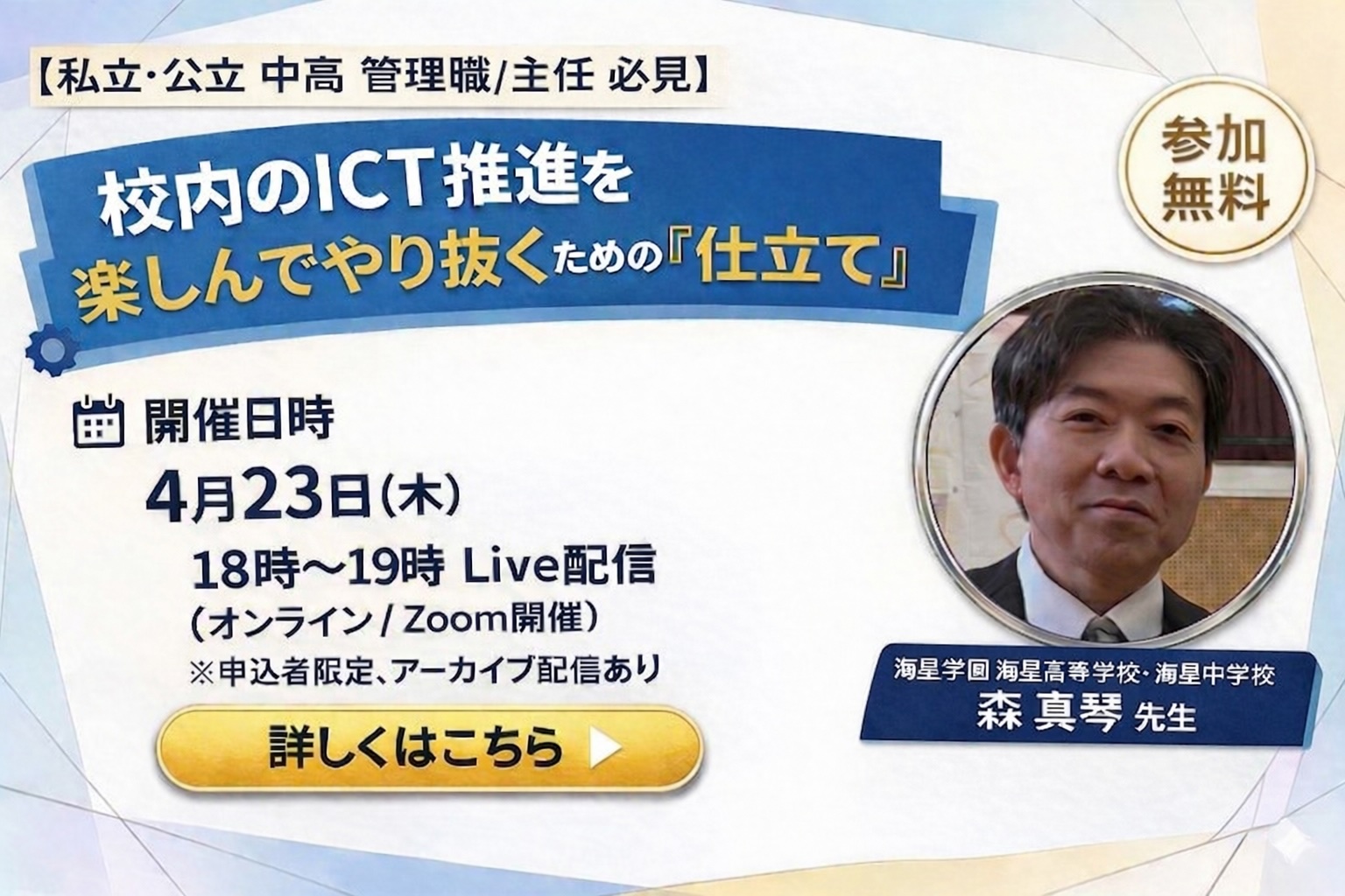 同セミナーでは、海星学園 海星中学校・海星高等学校の森 真琴教諭を講師に迎え、校内でICT活用を“効率よく回す”ために、どのような仕立て・役割設計・進め方を行ってきたのかを具体的に共有。ICT担当の属人化を前提とした上で、いかにして「組織を自走させるか」というリアルな戦略を公開する。