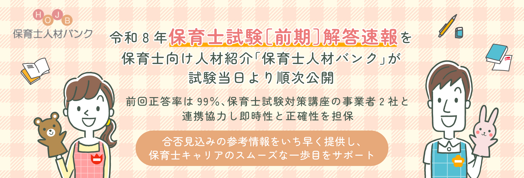 エス・エム・エス(SMS)は17日、保育士向け人材紹介「保育士人材バンク」が、4月18日・19日に実施される「令和8年保育士試験[前期]」の解答速報を試験当日からサービスサイトにて順次公開すると発表した。