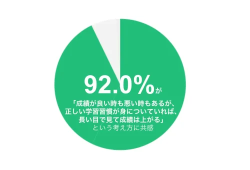 また、塾選びで重視する成績の上がり方については、85.1%が「長期間で見て成績が上がっていくこと」を重視すると回答した。一方、コノ塾の成績データ分析では、定期テストの点数は毎回連続して上がるケースは少なく、上下を繰り返しながらも長期的には上昇トレンドを描く傾向が確認されたという。