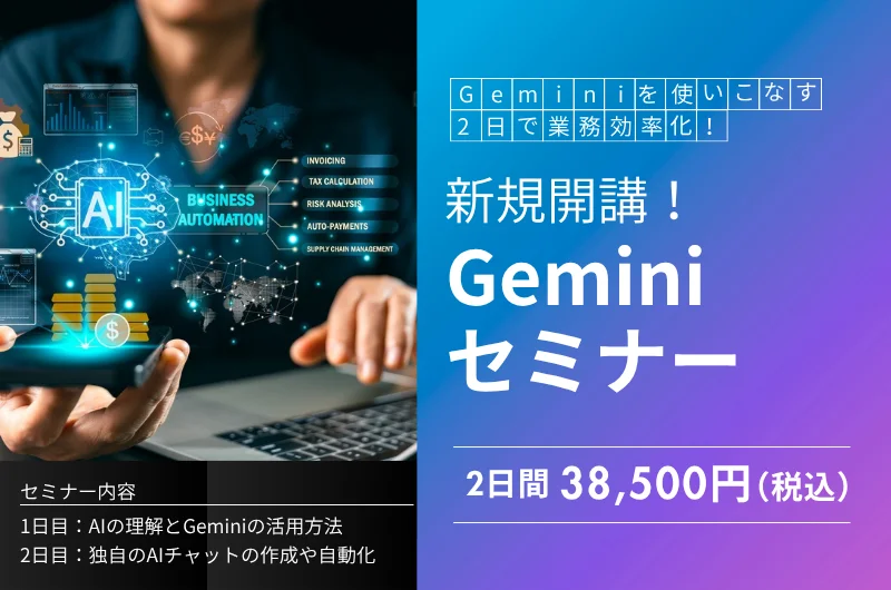 こうした背景から、Gemini未経験者でも2日間で基礎から実践的な業務活用までを習得できるカリキュラム「Geminiセミナー」を開講する。