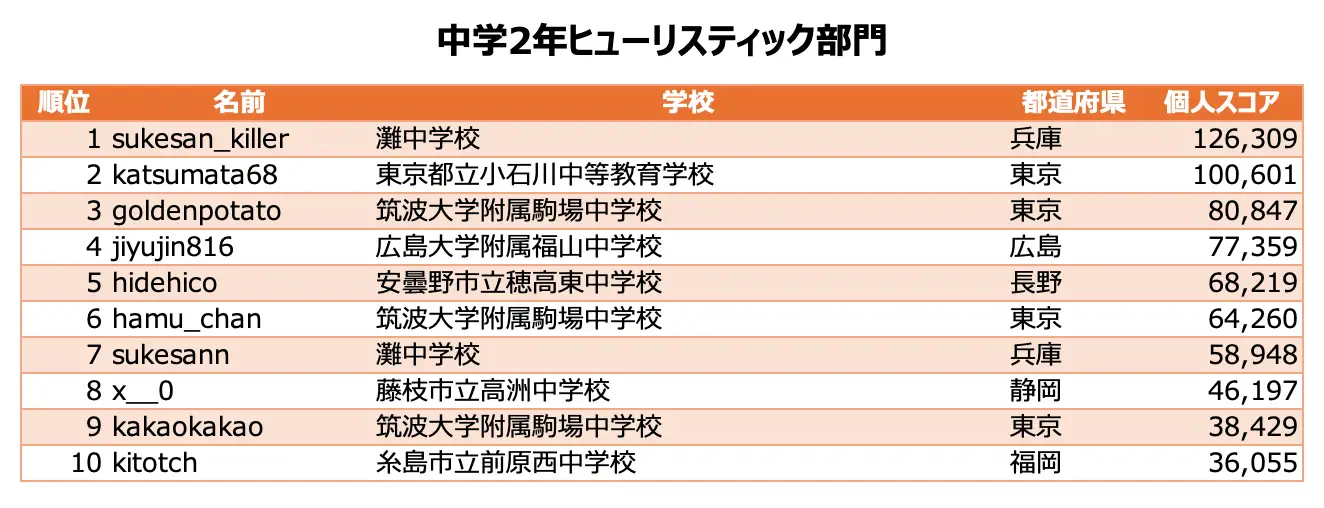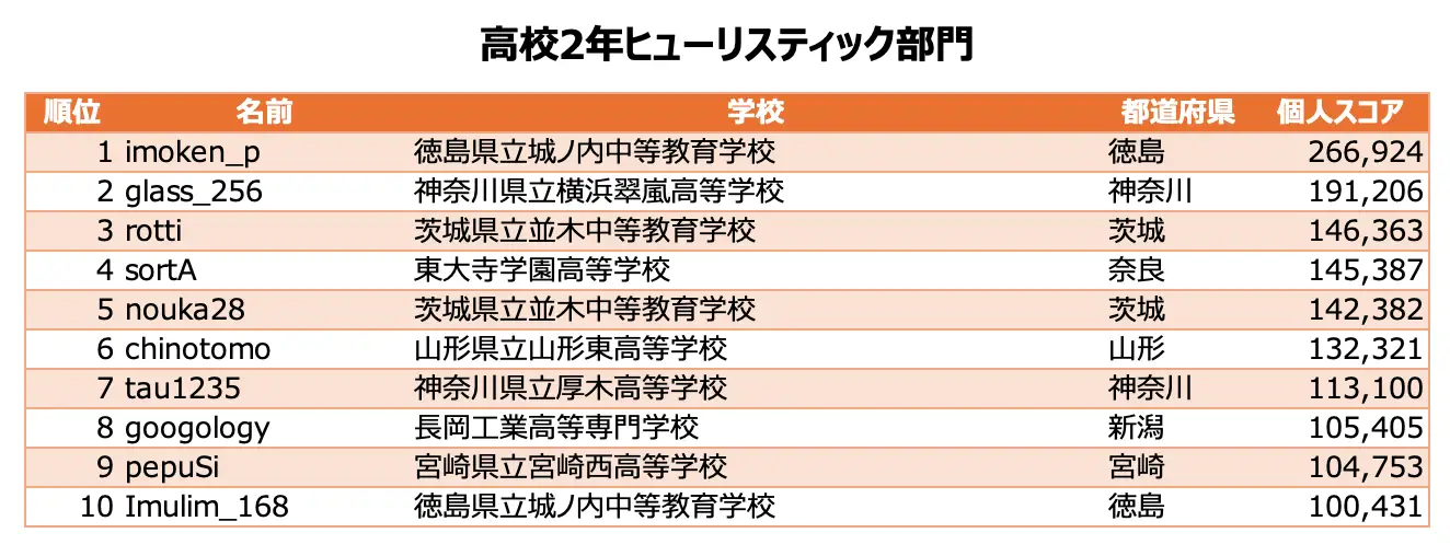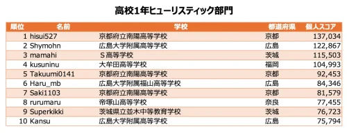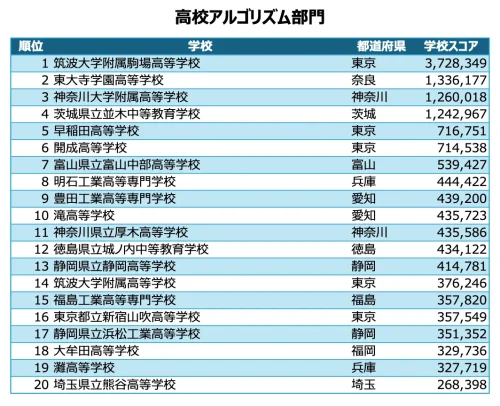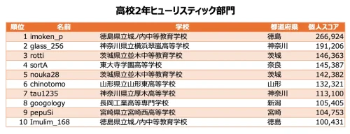 今回は昨年10月~今年3月の期間で開催し、中学校63校147名、高校168校451名の合計598名が参加、アルゴリズム部門は上位20校の中学校・高校と中学・高校各学年の上位20名、ヒューリスティック部門は上位10校の中学校・高校と中学・高校各学年の上位10名を、入賞校・入賞者として賞状や記念品を贈呈した。
