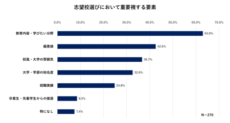 それによると、志望校選びで重視される項目は「教育内容・学びたい分野(学部・学科)」(63.0%)と「偏差値」(42.6%)がトップ2。