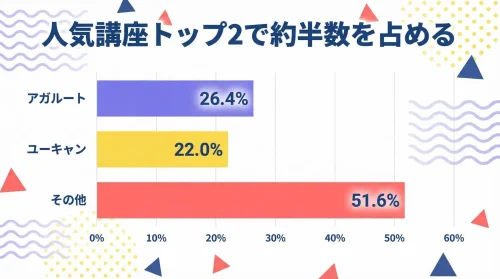 合格した年に利用した通信講座では、「アガルート」が26.4%でトップ、次いで「ユーキャン」が22.0%。この2講座だけで全体の約半数(48.4%)を占める結果となり、高い人気を誇っていることがわかる。