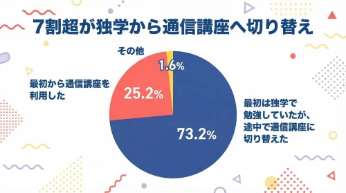「最初から通信講座を利用した」という25.2%を大きく上回り、多くの合格者が独学の限界を感じて講座利用に踏み切っている実態が明らかになった。