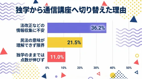 独学から通信講座へ切り替えた理由としては、「法改正などの情報収集に不安を感じたため」が36.2%で最多だった。