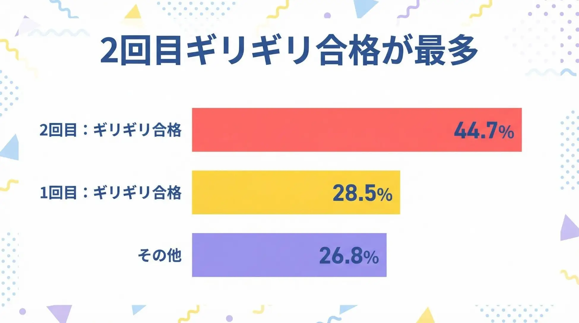 合格までの道のりを見ると、「2回目:ギリギリ合格」が44.7%と最も多く、「1回目:ギリギリ合格」が28.5%と続く。ストレート合格者(1回目合格)は全体の42.3%で、半数以上の受験者が複数回の挑戦を経て合格を掴んでいることがわかる。