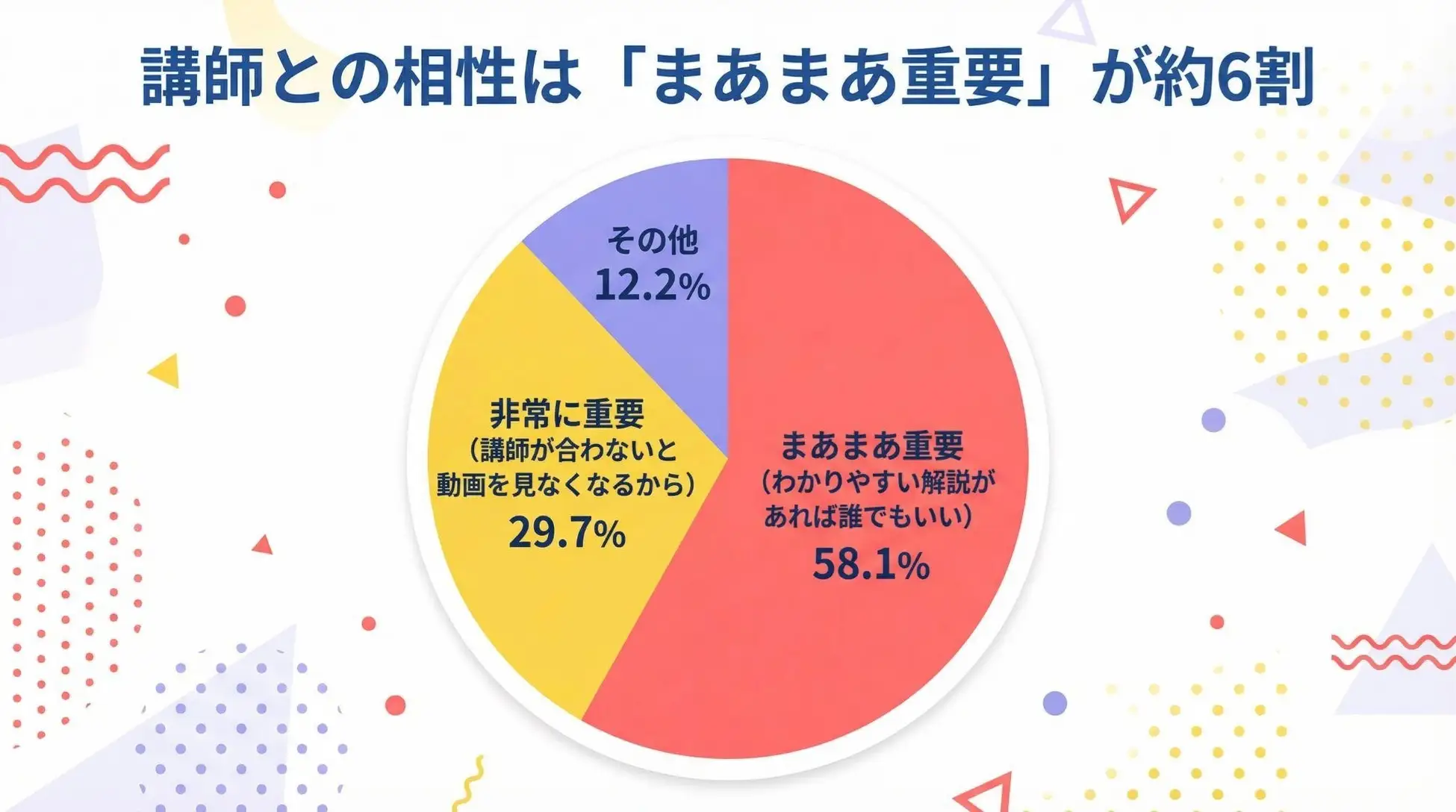 「非常に重要(講師が合わないと動画を見なくなるから)」の回答も29.7%あり、合計で87.8%の人が講師との相性を重視していることがわっかった。