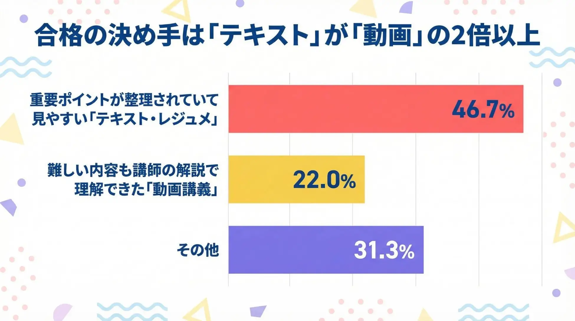 最も役立った教材・機能を尋ねたところ、「重要ポイントが整理されていて見やすい『テキスト・レジュメ』」が46.7%で1位となった。これは「難しい内容も講師の解説で理解できた『動画講義』」(22.0%)の2倍以上のスコアであり、自分のペースで読み込み、知識を整理できるテキスト教材への信頼の厚さがうかがえる。