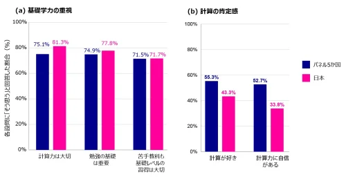 一方で、「計算力に自信がある」「計算が好き」といった計算の肯定感については、日本は他の5カ国を下回った。日本の子どもは基礎学力を重視する一方で、自分自身の計算に対する肯定感が控えめであることが明らかになった。