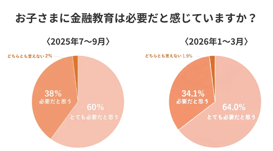 それによると、「子どもへの金融教育の必要性」を質問したところ、64%が「とても必要と思う」、34.1%が「必要と思う」と回答した。2025年7月〜9月の前回調査と比較すると、総数(98%)は変わらないものの、「とても必要」と答えた層が60%から64%に増加。こども支援NISAの制度創設や続く物価高、日経平均株価の史上最高値更新といった社会情勢を背景に、保護者の危機感や関心が一段と強まっているのが伺える。