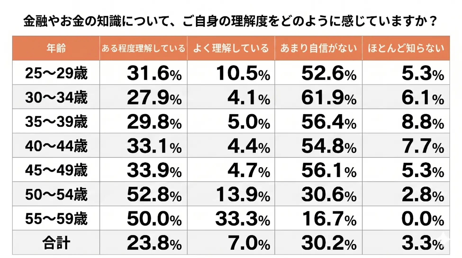 また、保護者自身の金融やお金に関する知識の理解度を調査したところ、全体で30.2%が「あまり自信がない」、3.3%が「ほとんど知らない」と回答。合わせると、3人に1人以上の保護者が自身の金融リテラシーに不安を抱えたまま、子どもの教育に向き合っている現状が浮き彫りになった。