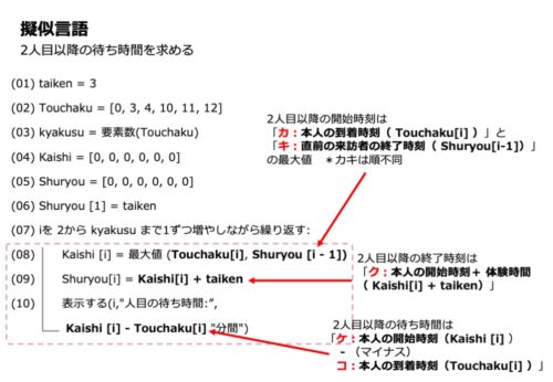 Scratchで確認したコードを擬似言語に置き換えれば、解答の完成です。