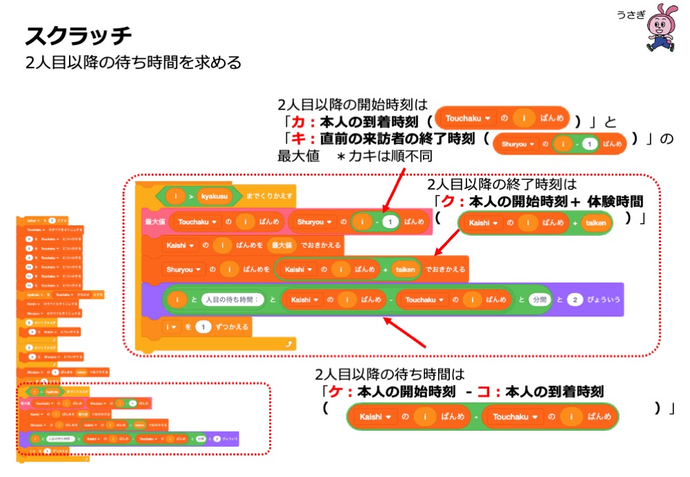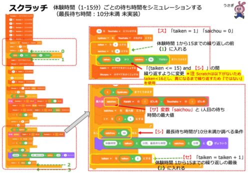 前回(Vol.42)は、「直前の来訪者の終了時刻と本人の到着時刻を比較して、開始時刻を決定、体験時間が3分の時の待ち時間を算出する」という基本部分をScratchで解説しました。