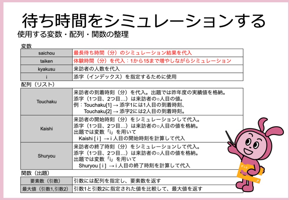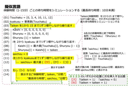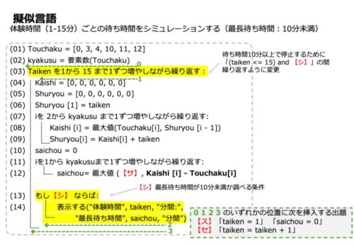今回の手順で、ゲームの体験時間を1分から15分まで変化させながら、最長待ち時間を比較するという二重ループの構造が完成し、大問3を解くことができました。
