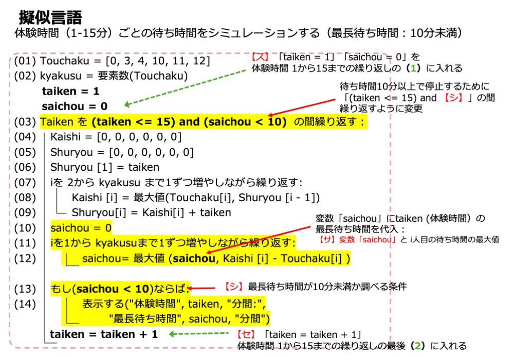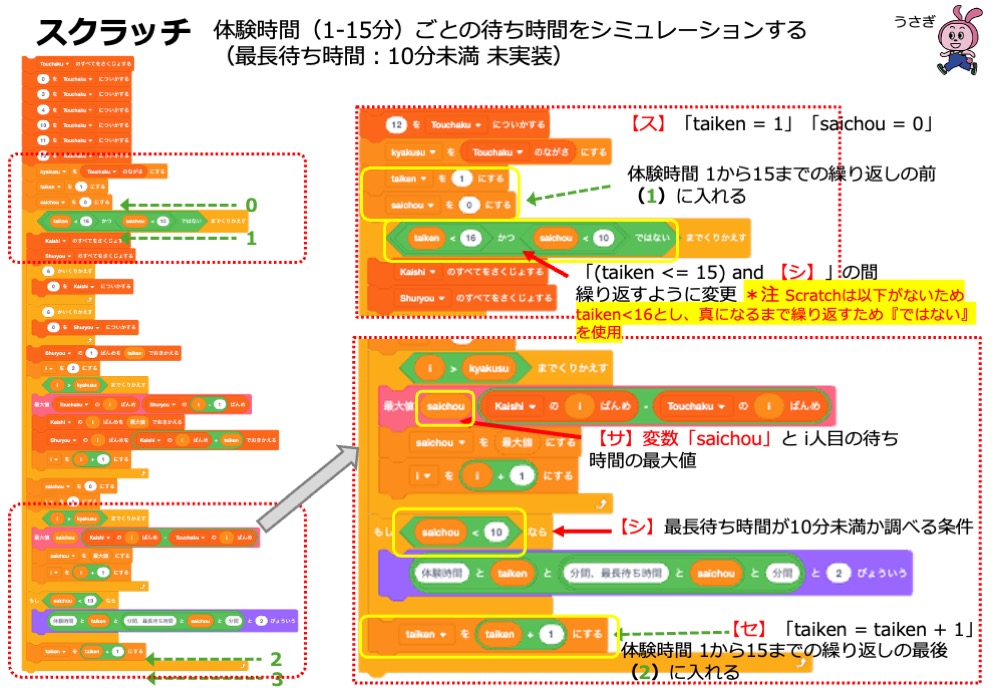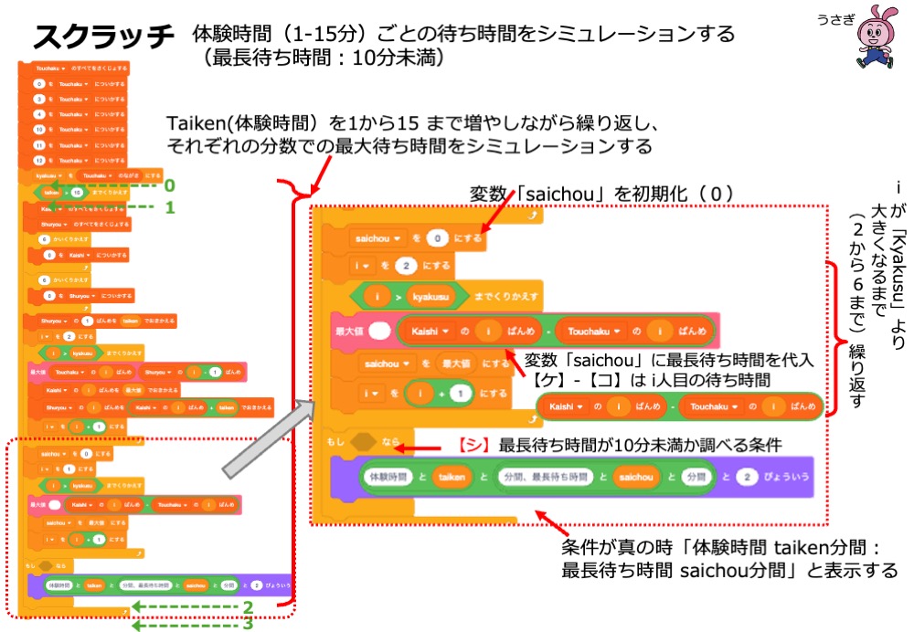 ループは「体験時間が15分以下」かつ「最長待ち時間が10分未満(saichou < 10)」の間繰り返します。この saichou < 10 は、結果を表示する際の判定条件(条件シ)とも共通しています。