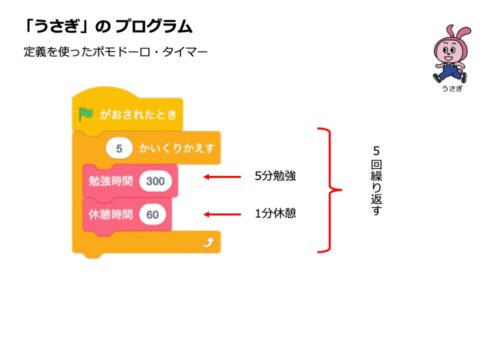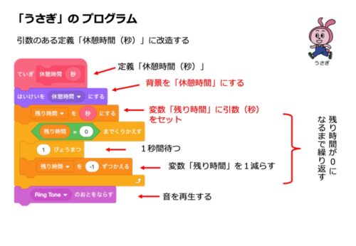 ・「残り時間を( )にする」の部分は、定義「休憩時間」の引数「秒」で入れ替える