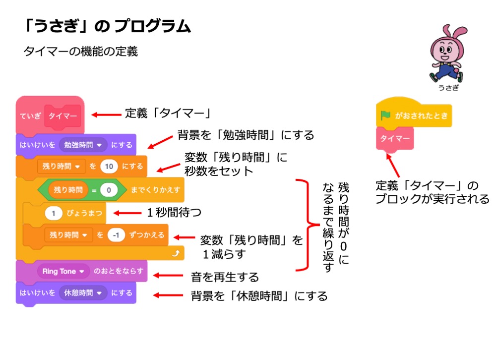 前回、「うさぎ」のスプライトで作成した「タイマー」の機能を振り返ります。