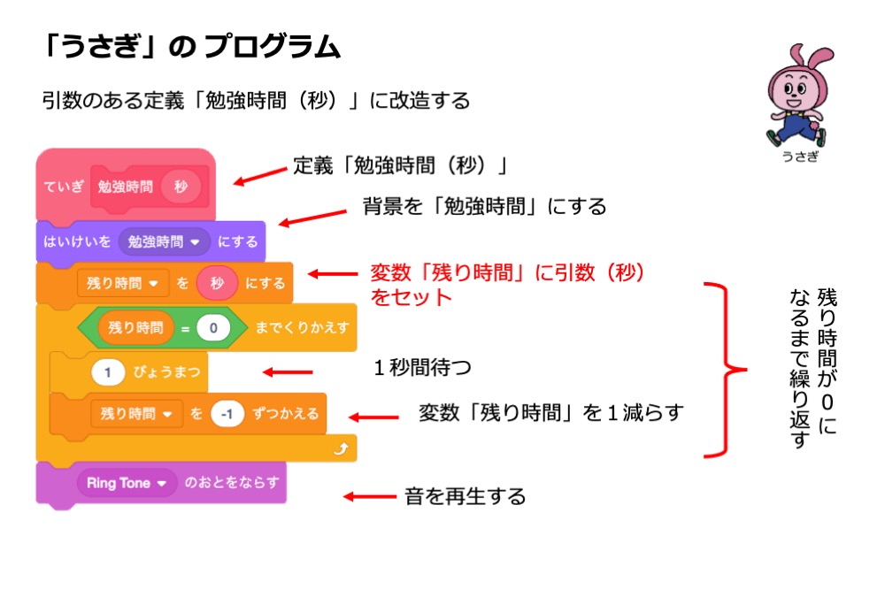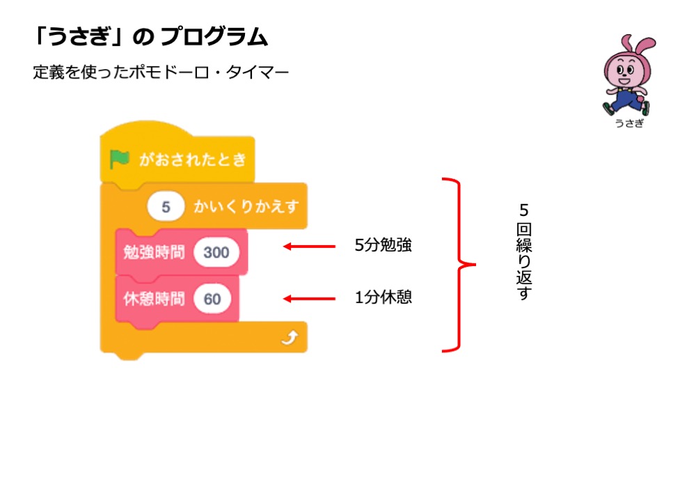 ・「残り時間を( )にする」の部分は、定義「休憩時間」の引数「秒」で入れ替える
