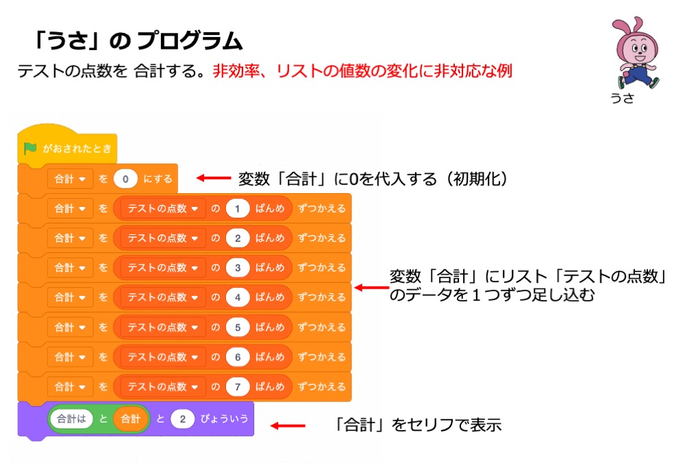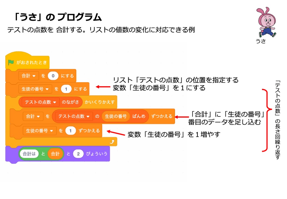 こうすることで1回目は、「(テストの点数)の1番目」を「合計」に足し算、2回目は「(テストの点数)の2番目」を足し算…テストの点数リストの最後のデータまで足していきます。最後に合計した点数をセリフで言わせます。